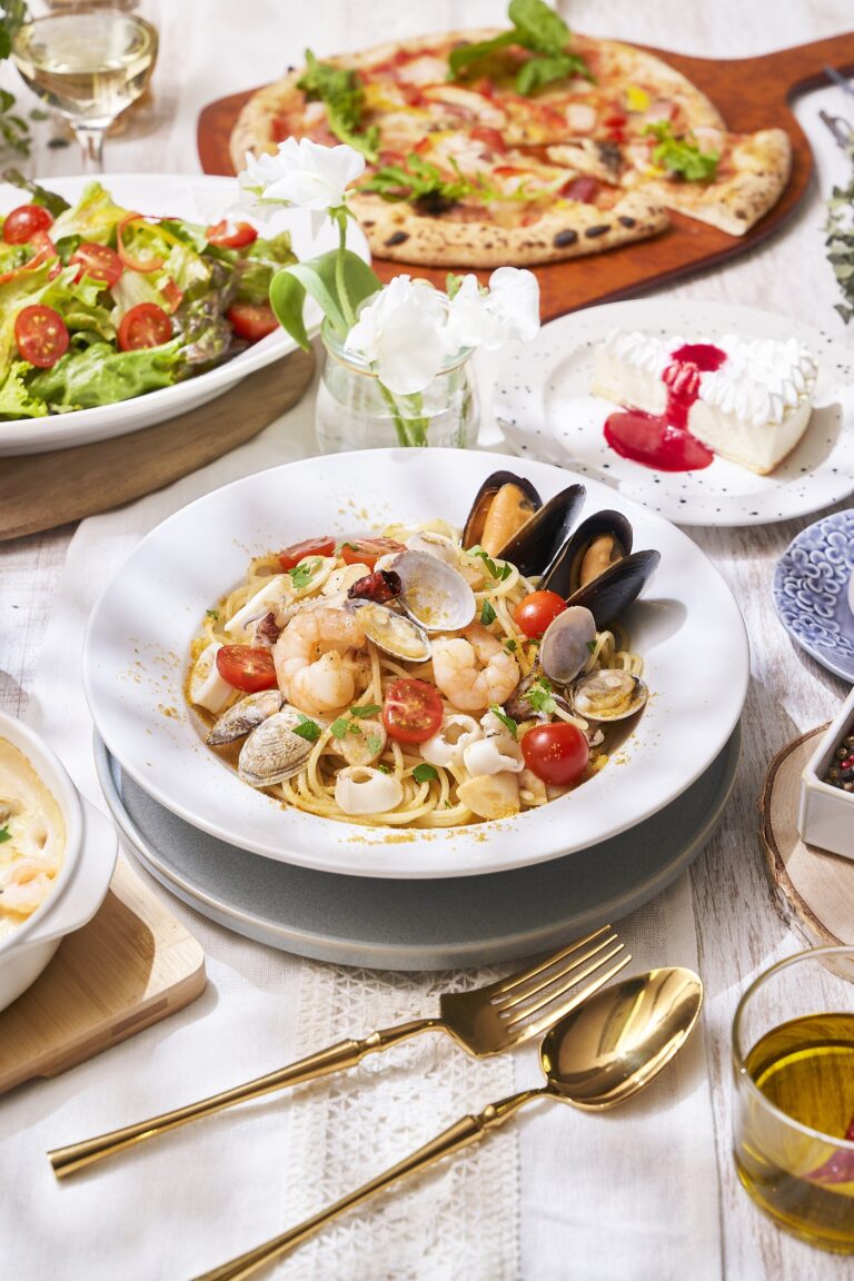 ピッツアやサラダ、食後のケーキまで並べば、気分はもうイタリアの休日